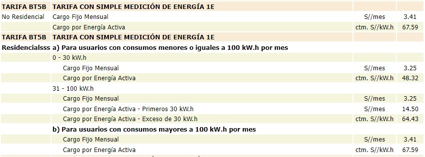 En lo que respecta a la opción tarifaria BT5B tambien contamos con 2 opciones dentro del mismo grupo tarifario; una opción para usuarios con un consumo de energía mensual hasta los 100 kwh y otro grupo tarifario para los usuarios que superen los 100 kwh. Como pueden apreciar en el cuadro tarifario la diferencia es mas significativa para el grupo tarifario (a) si es que el consumo de energía mensual no supera los 30 kwh. En esta tarifa residencial no se toma en cuenta las franjas de hora punta y fuera de punta.