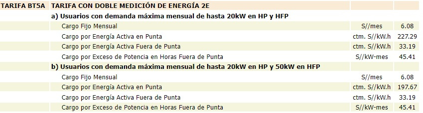 La tarifa BT5A esta pensada (sin ser excluyente) para pequeños comercios o edificios residenciales con una demanda máxima mensual de 20 kW en hora punta y fuera de punta. Dentro de esta tarifa también existe otro modelamiento que te permite llegar hasta los 50 kW pero solo en horas fuera de punta. Notese en el cuadro de tarifas la diferencia entre los costos de energía en hora punta y fuera de punta.